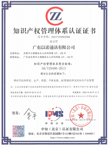 2019年9月,福日電子成員企業(yè)深圳市中諾通訊有限公司、廣東以諾通訊有限公司先后通過(guò)知識(shí)產(chǎn)權(quán)管理體系認(rèn)證,進(jìn)一步推進(jìn)公司知識(shí)產(chǎn)權(quán)管理工作規(guī)范化、系統(tǒng)化、科學(xué)化,提升企業(yè)核心競(jìng)爭(zhēng)力。